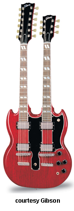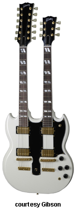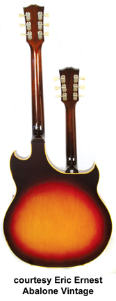 DOUBLE TWELVE | - double cutaway hollow maple body, carved spruce top, 2-stripe bound body, double neck configuration with 12- and 6-string necks, 2 bound black pickguards, 3-position neck selector switch, each mahogany neck has 20-fret bound rosewood fingerboard with pearloid parallelogram inlay, tune-o-matic bridge/fixed tailpiece, 6-per-side/3-per-side tuners with pearl buttons, chrome hardware, 2 covered humbucker pickups, volume/tone control, 3-position switch, available in Black, Sunburst, or White finishes, mfg. 1958-1962. |