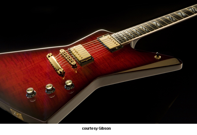 50 YEAR COMMEMORATIVE EXPLORER | - offset hourglass Explorer-style mahogany body, AA figured maple top with beveled edges, set Mahogany neck, 22-fret bound ebony fingerboard with pearl split block inlays and gold fretwire, hockey stick-style headstock with a unique Gibson logo that was designed by Ted McCarty, six-on-one-side Steinberger gearless tuners, tune-o-matic bridge, stop tailpiece, no pickguard, two '57 Classic covered humbucker pickups, three black top hat knobs with gold inserts (two v, tone), three-way pickup switch on upper treble bout, jack on side of guitar, gold hardware, available in Brimstone Burst finish, 24.75 in. scale, 1.695 in. nut width, limited edition with a total production of 1,000 guitars, mfg. 2008 only. |