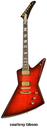 Explorer II (E2) | - similar to Explorer (Korina), except has 5-piece laminated walnut/maple body, maple neck, ebony fingerboard with dot inlay, E 2 engraved truss rod cover, tunable TP-6 stop tailpiece, gold hardware, 2 exposed coil humbucker pickups, available in Natural finish, mfg. 1979-1984. |