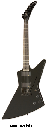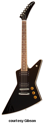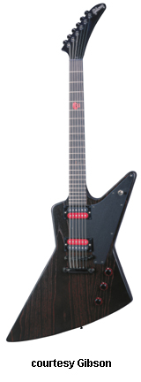 Explorer Gothic | - similar to the Explorer, except has Gibson's Gothic appointments which include a Satin Black finish, black chrome hardware, a black pickguard, truss-rod cover, and jack input plate, and no fingerboard inlays except a 12th fret moon and star design, mfg. 1998-2001. |