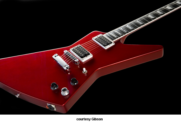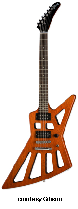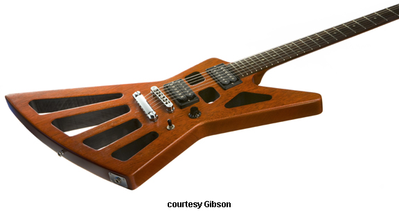 HOLY EXPLORER (MODEL DSHX) | - hourglass-shaped Explorer-style mahogany body with several carved vented openings, set mahogany neck, 22-fret rosewood fingerboard with acrylic dot inlays, hockey stick-style headstock with black overlay and Gibson logo, six-on-one-side mini Grover tuners, tune-o-matic bridge, stop tailpiece, no pickguard, two exposed humbucker pickups (496R neck, 500T bridge), single black numbered volume knob, three-way pickup switch, jack on side of guitar, chrome hardware, available in Satin Cherry finish, 24.75 in. scale, limited edition run of 350 instruments, hardshell case included, new 2009. |