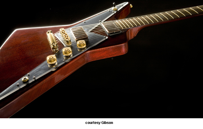 REVERSE EXPLORER | - reverse offset hourglass Explorer-style mahogany body, mahogany Explorer rounded neck, 22-fret rosewood fingerboard with small black block inlays at the 5th and 12th frets, Ted McCarty designed Moderne "Gumby"-style headstock with gold cursive Gibson logo, six-on-the-other-side Steinberger gearless tuners, tune-o-matic bridge, stop tailpiece, lightning bolt carbon fiber pickguard, two '57 Classic covered humbuckers, three gold numbered speed knobs (two v, tone), three-way pickup switch on the upper bass bout, gold hardware, available in Antique Walnut finish, 24.75 in. scale, black reptile pattern hardshell case with white plush interior included, limited edition run of 1,000 instruments, mfg. 2008 only. |