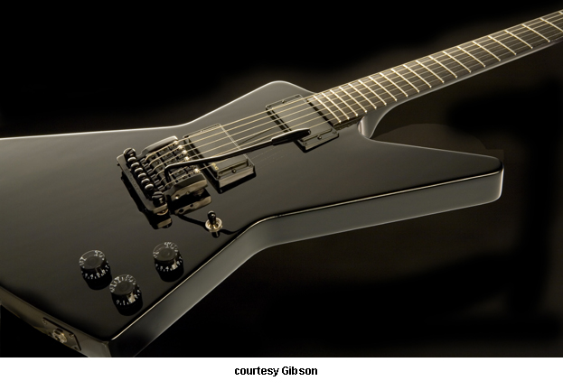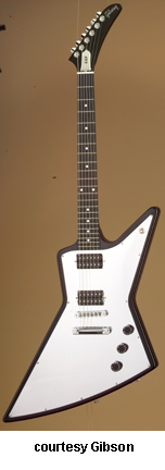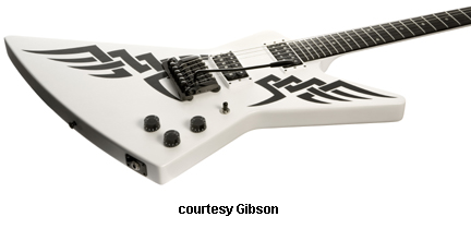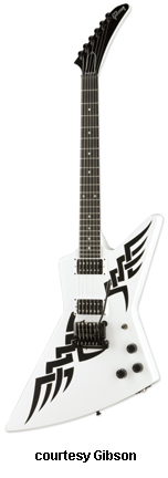 TRIBAL XPLORER (MODEL DSTX) | - hourglass-shaped Explorer-style mahogany body, set mahogany neck, 22-fret ebony fingerboard with acrylic dot inlays, hockey stick-style headstock with black overlay and Gibson logo, bell-shaped truss rod cover, six-on-one-side locking mini Grover tuners, Kahler tremolo bridge, no pickguard, two exposed humbucker pickups (496R neck, 500T bridge), three black speed knobs (two v, tone), three-way pickup switch, jack on side of guitar, black chrome hardware, available in Satin White with black tribal pattern paint graphics, 24.75 in. scale, hardshell case and certificate of authenticity included, limited edition run of 350 instruments, new 2009. |