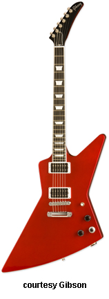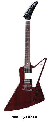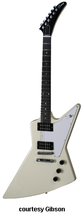 X-PLORER (DSXR, EXPLORER '76 REISSUE) | - offset hourglass mahogany body/neck, white or mirror (new 2002) pickguard, 22-fret rosewood fingerboard with pearl dot inlay, tune-o-matic bridge/stop tailpiece, blackface peghead with pearl logo inlay, six-on-a-side tuners, chrome hardware, two ceramic (496R and 500T) magnet humbuckers, 2 volume/1 tone controls, three-position switch, available in Cherry (disc. 2007), Classic White (CW), Ebony (EB), Natural, Natural Burst (disc. 2005), or Vintage Sunburst (VS, disc. 1994) finish, mfg. 1990-present. |