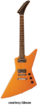 EXPLORER PRO (DSXP) | - Explorer-style, lightweight mahogany body, antique top body binding, mahogany neck, 22-fret rosewood fingerboard with dot inlays, hockey stick-style headstock with small Gibson logo, six-on-one-side Grover tuners, tune-o-matic bridge, stop tailpiece, two exposed humbucker pickups (496R neck, 500T bridge), three amber top hat knobs (two v, tone), three-way pickup switch, chrome hardware, available in Ebony or Natural (2007 only) finish, 24.75 in. scale, mfg. 2007-08. |