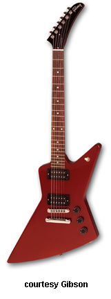 Explorer (I) | - similar to Explorer II, except has mahogany body, rosewood fingerboard with dot inlay, decal headstock logo, tune-o-matic bridge/stop tailpiece or black Kahler Flyer tremolo, 2 uncovered humbuckers, available in Black or White finishes, mfg. 1981-89. |