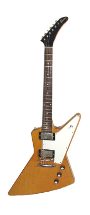 EXPLORER (KORINA) | - offset hourglass korina (African limba wood) body, white pickguard, korina neck, 22-fret rosewood fingerboard with pearl dot inlay, tune-o-matic bridge/stop tailpiece, blackface peghead with pearl logo inlay, 6-on-a-side tuners, gold (1958-59) or nickel (1962-63) hardware, 2 P.A.F. (1958-59) or patent number (1962-63) humbucker pickups, 2 volume/1 tone controls, 3-position switch, available in Natural finish, approx. 22 mfg. 1958-1959, parts clean-up during 1962-1963 (brown case 1958-59, black case 1962-63). |