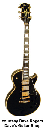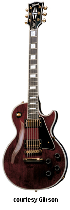 LES PAUL CUSTOM (SG BODY STYLE 1961-63 MFG.) | - double sharp cutaway mahogany body, white layered pickguard, mahogany neck, 22-fret bound ebony fingerboard with pearl block inlay, tune-o-matic bridge/side-pull gold plated Gibson vibrato, multi-bound peghead with pearl split diamond inlay, 3-per-side tuners, gold hardware, 3 covered humbucker pickups, 2 volume/2 tone controls, 3-position switch, available in Black or White finishes, mfg. 1961-63. |