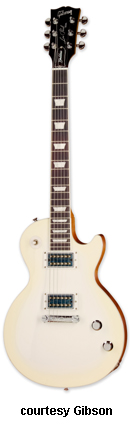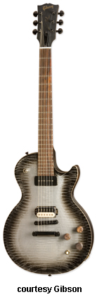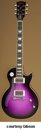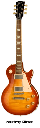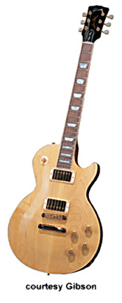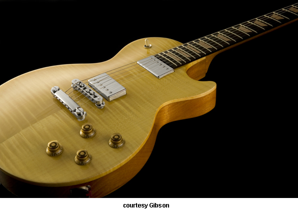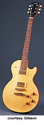 LES PAUL TRADITIONAL (LPTD) | - single cutaway Les Paul-style un-chambered mahogany body, carved maple (Ebony finish only) or AA figured maple top, single-ply body binding, C-shaped neck profile with short tenon, 22-fret bound rosewood fingerboard with pearl trapezoid inlays, black headstock logo with Gibson and Les Paul Model logos, bell-shaped truss rod cover engraved with "Traditional," three-per-side Tone Pros classic Kluston-style tuners, tune-o-matic bridge, stop tailpiece, raised cream pickguard, two covered humbucker pickups ('57 Classic neck, '57 Classic Plus bridge), four amber speed knobs (two v, two tone), three-way pickup switch, chrome hardware, available in Desert Burst, Ebony, Gold Top with Aged Cherry back and sides, Heritage Cherry Sunburst, Honey Burst, Ice Tea, or Light Burst finish, 24.75 in. scale, black snakeskin case included, mfg. summer 2008-present. |