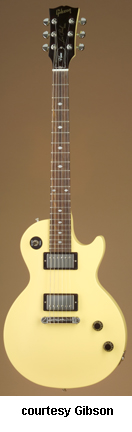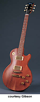LES PAUL SMARTWOOD STANDARD (LPSW) | - single cutaway mahogany body, (Alternative wood project Les Paul model), carved top, 22-fret fingerboard with pearl dot inlay, tune-o-matic bridge/stop tailpiece, blackface peghead with pearl logo inlay, "SmartWood" engraved on truss rod cover, 3-per-side tuners, gold hardware, 2 covered humbucker pickups, 2 volume/2 tone controls, 3-position switch, available in Antique Natural (AN) finish, mfg. 1995-2001. |