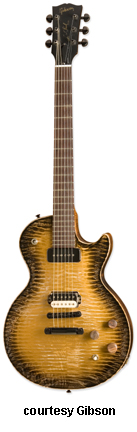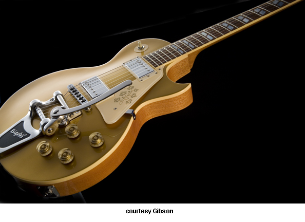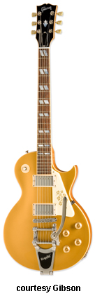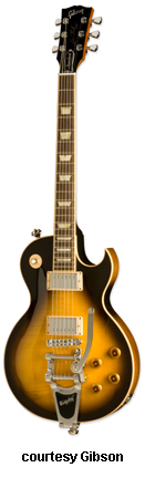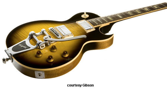 LES PAUL FLORENTINE WITH BIGSBY (LPFT) | - single cutaway Les Paul-style mahogany body, AA maple top, cream body binding, set asymmetrical profile mahogany neck, 22-fret cream bound rosewood fingerboard with figured acrylic trapezoid inlays, black headstock overlay with gold "Gibson" and "Les Paul Model" logos, bell-shaped truss rod cover with "Standard" logo, three-per-side Grover Kluson-style tuners, Schaller roller bridge, Bigsby tremolo tailpiece, no pickguard, two Burstbucker covered humbucker pickups, four amber top hat knobs (two v, two tone), three-way pickup switch, chrome hardware, available in Vintage Sunburst finish, 24.75 in. scale, black hardshell case included, limited edition run of 350 instruments, new 2009. |