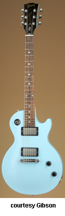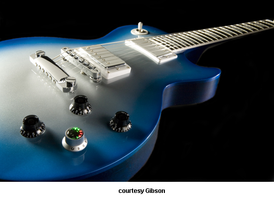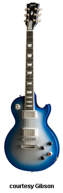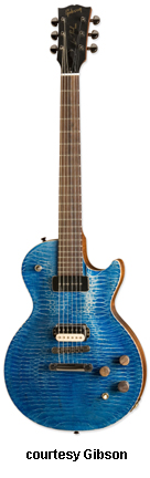 LES PAUL ROBOT LIMITED EDITION | - single cutaway Les Paul-style chambered mahogany body, maple top, set mahogany neck, 22-fret bound ebony fingerboard with pearl trapezoidal inlays, bound headstock with pearl Gibson logo and flowerpot inlay, chrome truss rod cover with "Robot Guitar" engraved, three-per-side robotic Powerhead Locking tuners, tune-o-matic Tune Control bridge, data-transmitting stop tailpiece, two chrome covered humbucker pickups (490R, 498T), four knobs (three normal, and one Master Control Knob that controls the robotic actions of the guitar), three-way pickup switch, chrome hardware, available in Blue Silverburst finish, mfg. late 2007 only. |