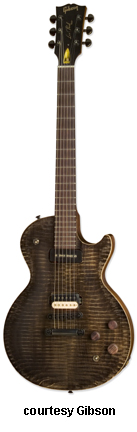 LES PAUL BFG (LPBG) | - single cutaway mahogany body, carved plain maple top, 1950s-style rounded mahogany neck, 22-fret rosewood fingerboard with no inlays, black headstock with no truss rod cover, three-per-side Grover tuners, tune-o-matic bridge, stop tailpiece, one P-90 pickup (neck) and one Zebra Burstbucker exposed humbucker pickup (bridge), three wood knobs (two v, tone), three-way pickup switch, kill switch toggle, distressed black chrome (Trans. Black and Trans. Gold finish) or gun metal (Trans. Cherry finish) hardware, available in Trans. Black, Trans. Cherry, or Trans. Gold finish, 24.75 in. scale, mfg. 2007-08. |