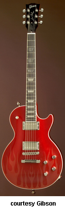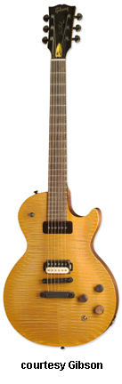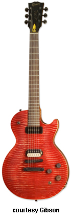 LES PAUL GT (LPGT) | - single sharp cutaway mahogany body with maple top, mahogany neck with ebony fingerboard and pearl trapezoid inlays, chrome hardware, humbucker pickups (one smoky coil), Classic '50s Les Paul neck, push/pull volume and tone controls for coil splitting, Dunlop strap locks, tune-o-matic bridge, Neutrik locking cable jack, locking Grover tuners, available in Candy Apple, Candy Orange, Muscle Green, Phantom Black, or Daytona Blue finish, mfg. 2006-07. |