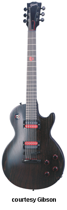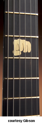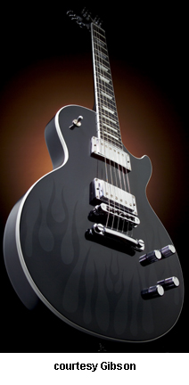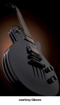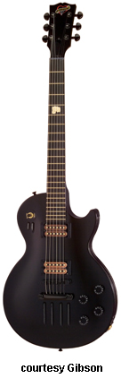 LES PAUL MENACE (LPGM) | - single sharp cutaway body with maple top and mahogany back, mahogany neck with ebony fingerboard, features brass fist inlaid between 4th and 5th fret, smoky coil humbucker pickups w/o covers, chrome hardware, tatoo style Gibson logo, available in Flat Black finish only, mfg. 2006-08. |