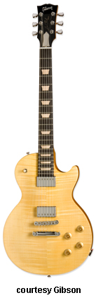 LES PAUL PUSH-TONE | - single cutaway Les Paul-style mahogany body, AAA mpale top, mahogany '50s rounded neck, 22-fret rosewood fingerboard with maple trapezoidal inlays, black headstock overlay with pearl logo and "Les Paul Model" inlay, chrome truss rod cover, three-per-side locking Grover Keystone tuners, Tone Pro tune-o-matic bridge, Tone Pro stop tailpiece, no pickguard, two interchangeable BurstBucker Pro covered humbucker pickups, four gold top hat knobs (two v, two tone), three-way pickup swith on the upper bass bout, chrome hardware, available in Natural finish, 24.75 in. scale, limited edition run of 1,000 instruments, mfg. 2008 only. |