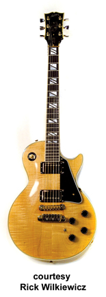 LES PAUL CUSTOM TWENTIETH ANNIVERSARY | - single sharp cutaway multi-bound mahogany body with carved top, raised bound black pickguard, mahogany neck, 22-fret bound ebony fingerboard with pearl block inlay, Twentieth Anniversary engraved into block inlay at 15th fret, tune-o-matic bridge/stop tailpiece, multi-bound peghead with pearl split diamond/logo inlay, 3-per-side tuners with plastic buttons, gold hardware, 2 humbucker pickups, 2 volume/2 tone controls, 3-position switch, available in Black, White, or Cherry Sunburst finishes, 60 mfg. 1974-75 only. |