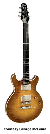 LES PAUL DC PRO (CSDC4TH[ ]NH) | - offset double cutaway mahogany back, bound AAA flamed maple top, set-in mahogany neck, 24.75 in. scale, 24-fret ebony fingerboard with pearl dot inlay, tune-o-matic bridge/stop tailpiece, 3-per-side Schaller mini-tuners, black slimmed peghead with pearl logo inlay, nickel hardware, 2 covered humbuckers ('57 Classic/'97 Classic), master volume/master tone controls, 3-way toggle, available in Butterscotch (BS), Faded Cherry (FC), Trans. Black (TB), and Trans. Indigo (TI) finishes, mfg. by the Custom Shop 1997-2001. |