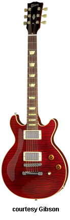 LES PAUL DC STANDARD (LPS2) | - offset double cutaway mahogany back, AAA flamed maple top, set-in mahogany neck, 24.75 in. scale, 24-fret bound rosewood fingerboard with pearloid trapezoid inlay, tune-o-matic bridge/stop tailpiece, 3-per-side tuners, black peghead, chrome hardware, 2 covered (490R/498T) humbuckers, volume/tone controls, 3-way toggle, available in Trans Red (TR), Translucent Amber (TA), Trans Black (BL), Root Beer (RO, new 2006), Midnight Burst (MD, disc.), Amber Serrano (AS, disc.), Blue Diamond (BD, disc.), Black Pepper (BP, disc.), Green Jalapeno (GJ, disc.), and Red Hot Tamale (RT, disc.) lacquer translucent finishes, standard production, mfg. 1998-99, 2001-06. |