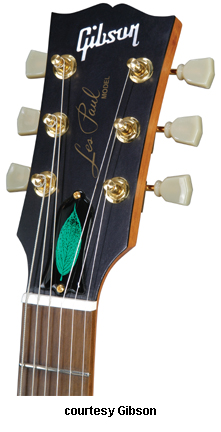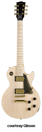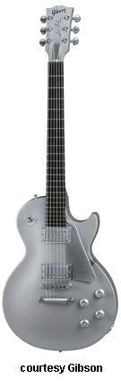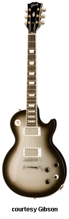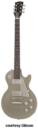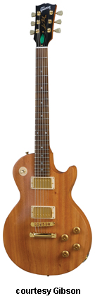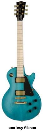 LES PAUL STUDIO RAW POWER (LPSRP) | - single cutaway Les Paul-style maple body, set mahogany neck, 22-fret maple fingerboard with figured acrylic dots and 12th fret trapezoid inlays, black headstock overlay with Gibson and Les Paul Model logos, bell-shaped truss rod cover with "Studio" logo, three-per-side Grover Kluson-style tuners with green keys, tune-o-matic bridge, stop tailpiece, raised black or smoky arcylic (Natural Satin finish only) pickguard, two '57 Classic covered humbucker pickups, four black speed knobs (two v, two tone), three-way pickup switch, chrome or gold hardware, available in Natural Satin, Platinum, Satin Aquamarine, Satin Blue/Platinum, Satin Gold, Satin Olive Green, Satin Trans. Ebony, Satin White, or Satin Yellow finish, 24.75 in. scale, gig bag included, new 2009. |