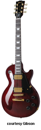 LES PAUL STUDIO ROBOT LTD. (RBLST) | - single cutaway Les Paul-style chambered mahogany body, maple top, set mahogany neck, 22-fret rosewood-bound (standard finishes) or white-bound (metallic finishes) ebony fingerboard with pearl trapezoidal inlays, white-bound headstock with MOP Gibson logo and flowerpot inlay (metallic finishes) or unbound headstock with screened logo (standard finishes), three-per-side robotic Powerhead Locking tuners, tune-o-matic Powertune bridge, Powertune stop tailpiece, two chrome covered humbucker pickups (490R, 498T), four knobs (three normal, and one Master Control Knob that controls the robotic actions of the guitar), three-way pickup switch, Neutrik jack on side of guitar, chrome hardware, available in the following standard finishes: Ebony, Desertburst, Fireburst, Manhattan Midnight, Wine Red, or the following metallic finishes: Green Metallic, Purple Metallic, Red Metallic, Silverburst, 24.75 in. scale, mfg. 2008-present. |