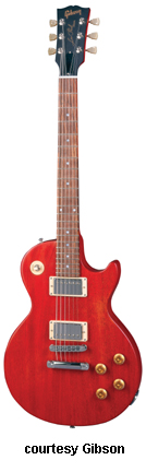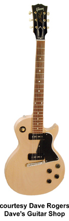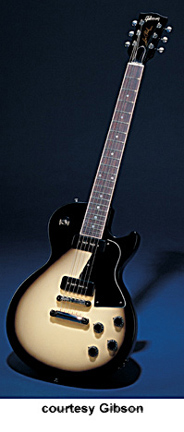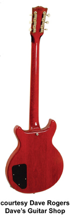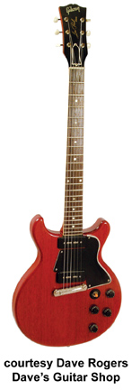 Les Paul Special Double Cutaway | - reissue of the double cutaway Les Paul Special, rounded horns, two black soapbar P-90 pickups, 22-fret bound rosewood fingerboard, 24 3/4 in. scale, mahogany neck, tune-o-matic bridge, dot inlays, metal tuner buttons and chrome hardware, available in Ebony, Cherry (new 1979), Limed Mahogany (new 1979), Tobacco Sunburst, Sunburst, or Wine Red finishes, mfg. 1976-1988. |