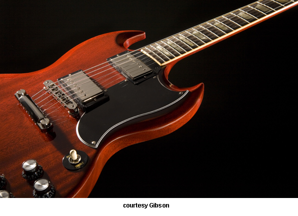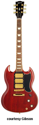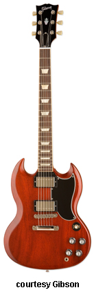 SG '61 REISSUE (SG61) | - double cutaway mahogany body, mahogany neck, 22-fret bound rosewood fingerboard with pearl trapezoid inlay, blackface peghead with pearl plant/logo inlay, three-per-side tuner with pearl buttons, tune-o-matic bridge, stop or optional Gibson deluxe lyre vibrola (2001-02), layered black pickguard, two covered humbucker pickups, four knobs (two v, two tone), three-way pickup switch, nickel hardware, available in Heritage Cherry finish, mfg. 1986-present. |