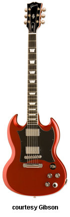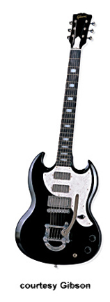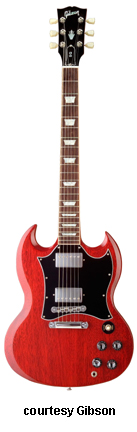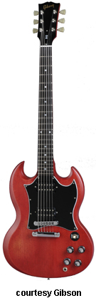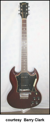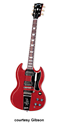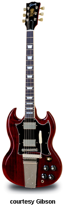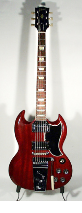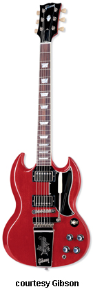 GIBSON | ELECTRIC: SG SERIES | In 1961, the new SG (solid guitar) body shape with double pointed cutaway was originally intended to bring a new style to the Les Paul line. But without Les Paul's approval, they were renamed the SG during 1963. The first two years of SG production (1961-end of 1963) in this series have Les Paul logos on their pegheads or the area below the fingerboard (see Les Paul section). | SG STANDARD (MFG. 1963-1970) | - double sharp cutaway mahogany body, layered black pickguard, one piece mahogany neck, 22-fret bound rosewood fingerboard with pearl trapezoid inlay, tune-o-matic bridge/side-pull vibrato, blackface peghead with pearl logo inlay, 3-per-side tuners, nickel hardware, 2 covered humbucker pickups, 2 volume/2 tone controls, 3-position switch, available in Cherry finish, approx. 16,700 mfg. 1963-1970. |