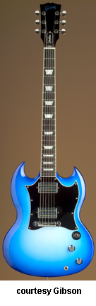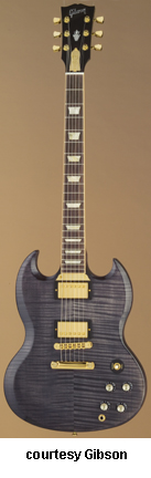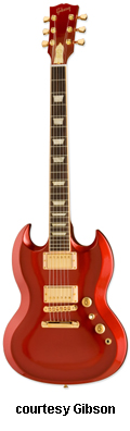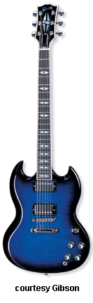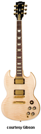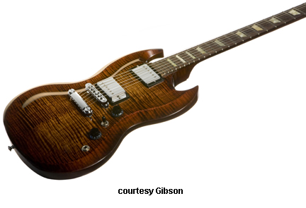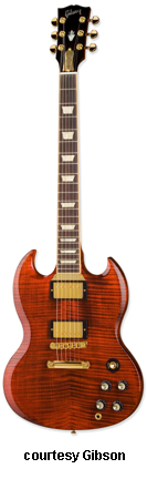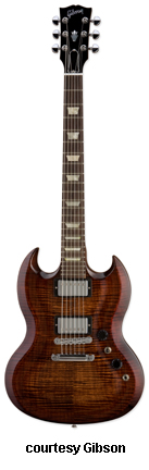 SG CARVED TOP | - symmetrical sharp double cutaway SG-style mahogany body, AAA carved maple top, set mahogany neck, 24-fret rosewood fingerboard with acrylic trapezoid inlays, black headstock overlay with MOP Gibson logo and holly inlay, three-per-side Grover Kidney tuners, tune-o-matic bridge, stop tailpiece, no pickguard, two covered Burstbucker Pro humbucker pickups, two black speed knobs (v, tone), three-way pickup switch, jack on face of guitar, chrome hardware, available in Autumn Burst finish, 24.75 in. scale, hardshell case included, limited edition run of 350 instruments, new 2009. |