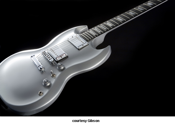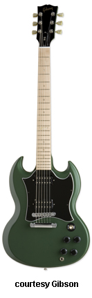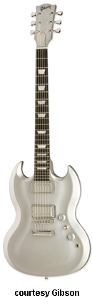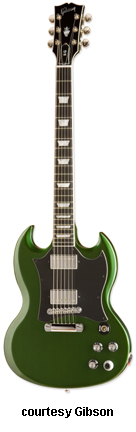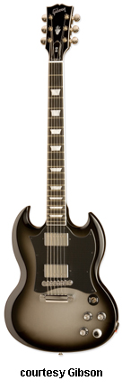 SG RAW POWER (SGRP) | - symmetrical sharp double cutaway SG-style maple body, set mahogany neck, 22-fret maple fingerboard with figured acrylic dots and 12th fret trapezoid inlays, black headstock overlay with Gibson logo, bell-shaped truss rod cover with "SG" logo, three-per-side Grover Kluson-style tuners with green keys, tune-o-matic bridge, stop tailpiece, black or smoky arcylic (Natural Satin finish only) pickguard, two '57 Classic exposed humbucker pickups, four black top hat knobs (two v, two tone), three-way pickup switch, chrome hardware, available in Natural Satin, Platinum, Satin Aquamarine, Satin Blue/Platinum, Satin Gold, Satin Olive Green, Satin Trans. Ebony, Satin White, or Satin Yellow finish, 24.75 in. scale, gig bag included, new 2009. |