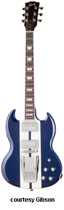 SG GT (SGGT) | - double cutaway mahogany body, Classic '61 mahogany neck with ebony fingerboard and pearl trapezoid inlays, chrome hardware, oversized tune-o-matic bridge, locking Grover tuners, Alnico magnet humbucker pickups, over/under dual truss rod for extra neck reinforcement, Dunlop strap locks, Neutrik TM locking cable jack, independent volume controls, available in Candy Apple, Candy Orange, Muscle Green, Phantom Black, or Daytona Blue with two contrasting stripes on top, mfg. 2006-07. |