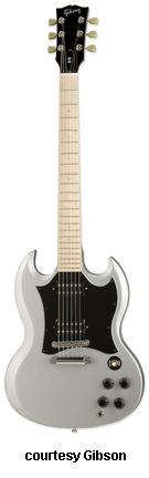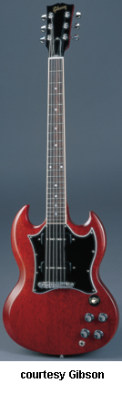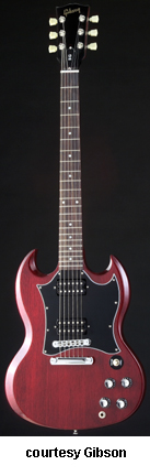 SG SPECIAL (SGSP) | - double sharp cutaway mahogany body, maple neck, 22-fret rosewood fingerboard with pearl dot inlay, tune-o-matic bridge/stop tailpiece, blackface peghead with silkscreened logo inlay, 3-per-side tuners, chrome hardware, black pickguard, two humbucker pickups, volume/tone controls, three-way pickup switch, available in Alpine White (disc. 1998), Blue Teal Flip-Flop (2001-05), Creme (mfg. 1999-2000), Ebony, Ebony Stain (1999-2000), Ferrari Red (disc.), Heritage Cherry (new 2009),Platinum (2003-05), Plum (mfg. 1999-2000), Pewter (2002 only), TV Yellow (disc. 1994), or Wine Red (2001-present) finish, gig-bag included, mfg. 1983-present. |