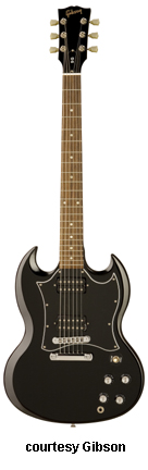 SG CLASSIC | - double sharp cutaway SG-style mahogany body inspired by the late 1960s SG Special, mahogany neck, 22-fret bound rosewood fingerboard with pearloid dot inlays, black headstock overlay with pearl Gibson logo, "Classic" engraved truss rod cover, three-per-side vintage tuners with white buttons, tune-o-matic bridge, stop tailpiece, layred black pickguard, two P-90 pickups, four knobs (two v, two tone), three-way pickup switch, chrome hardware, gig bag included, available in Ebony Stain or Heritage Cherry finish, 24.75 in. scale, mfg. 1999-2001, 2003-07. |