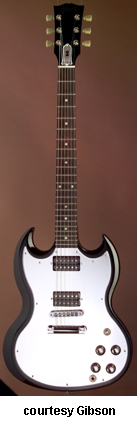 SG JR. | - double cutaway mahogany body (same size as SG Standard), mahogany neck, 22-fret rosewood fingerboard with pearl dot inlay, tune-o-matic bridge/stop tailpiece, 3-per-side tuners with plastic buttons, nickel hardware, black pickguard, single coil pickup, volume/tone control, available in White or Cherry finish, mfg. 1963-1970. |