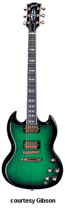 SG SUPREME (SGSU) | - double sharp cutaway mahogany body with AA flame maple top, mahogany slim tapered (1959 style) neck with ebony fingerboard featuring split diamond inlays, bound neck and headstock, two P-90A black pickups (disc. 2001), two '57 Classic humbucker pickups, tune-o-matic bridge and stop tailpiece, gold hardware, available in Emerald Burst (2001-07), Fireburst, Lavaburst (2001-03), Midnight Burst (2001-07), Trans. Black (2004-07) finish, mfg. 1999-2008. |