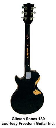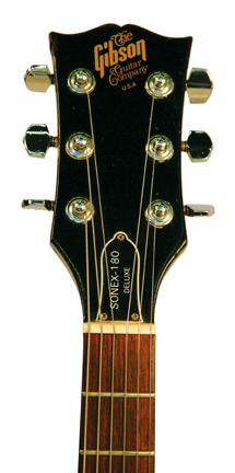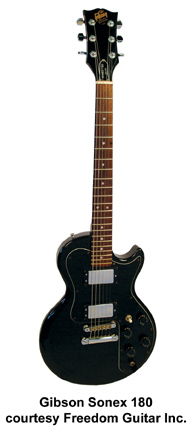 GIBSON | ELECTRIC: SONEX SERIES | | SONEX-180 CUSTOM | - single cutaway composite body, black pickguard, bolt-on maple neck, 22-fret ebony fingerboard with dot inlay, tune-o-matic bridge/stop tailpiece, blackface peghead with decal logo, 3-per-side tuners, chrome hardware, 2 exposed humbucker pickups, 2 volume/2 tone controls, 3-position switch, available in Ebony or White finishes, mfg. 1981-82. |