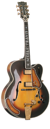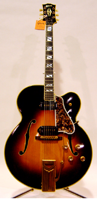 GIBSON | ELECTRIC: SUPER 400 CES SERIES | | SUPER 400 CES | - single round cutaway grand auditorium style body, arched spruce top, bound f-holes, raised multi-bound mottled plastic pickguard, figured maple back/sides, multiple bound body, 3-piece figured maple/mahogany neck, model name engraved into heel cap, 14/20-fret bound ebony fingerboard with point on bottom, pearl split block fingerboard inlay, adjustable rosewood bridge with pearl triangle wings inlay, gold trapeze tailpiece with engraved model name, multi-bound blackface peghead with pearl split diamond/logo inlay, pearl split diamond inlay on back of peghead, 3-per-side tuners, gold hardware, two single coil (P-90 or Alnico) or humbucker pickups, 2 volume/2 tone controls, 3-position switch, available in Ebony, Natural (introduced 1952), Sunburst (introduced 1951), or Wine Red finishes, 18 in. wide body, 21.75 in. long by 3.375 in. deep, 25.5 in. scale, limited mfg. (approx. 20-50 each year) 1951-1994. |