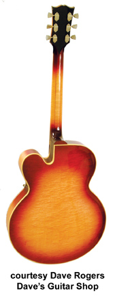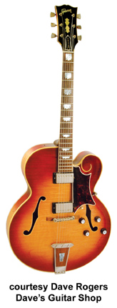 GIBSON | ELECTRIC: TAL FARLOW SERIES | | TAL FARLOW | - single round cutaway bound hollow body, arched figured maple top, bound f-holes, scroll style inlay on cutaway, raised black bound pickguard, maple back/sides/neck, 20 bound rosewood fingerboard with pearl reverse crown inlay, tune-o-matic bridge/trapeze tailpiece, rosewood tailpiece insert with pearl engraved block inlay, bound peghead with pearl crown/logo inlay, 3-per-side tuners, chrome hardware, 2 covered humbucker pickups, 2 volume/2 tone controls, 3-position switch, available in Brown Sunburst finish, approx. 215 mfg. 1962-1967. |