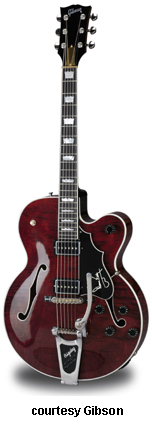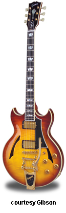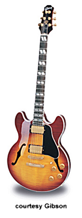 BYRDLAND (HSBY{ }GH) | - single rounded cutaway multi-ply bound hollow body, solid spruce top, bound f-holes, maple back/sides/neck, 23.5 in. scale, 22-fret multi-ply bound ebony pointed fingerboard with pearl block inlay, ABR-1 bridge with rosewood base/trapeze tailpiece, multi-ply bound blackface peghead with pearl flowerpot/logo inlay, three-per-side tuners, gold hardware, raised bound tortoise pickguard, two covered humbucker ('57 Classic PAF Reissue) pickups, four knobs (two v, two tone), three-way selector switch (on treble bout), available in Wine Red, Natural, or Vintage Sunburst finish, Body Width 17 in., Body Depth 2.25 in., this model is part of the Historic Collection, mfg. 1998-present. |