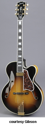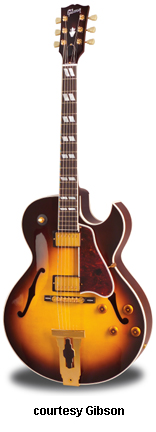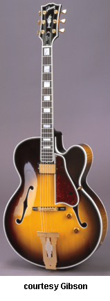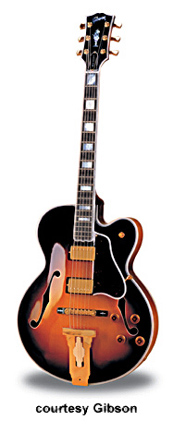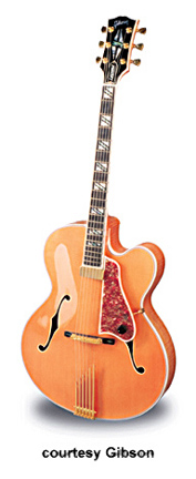 L-5 CT (HSLCT{ }GH) | - single rounded cutaway bound hollow thinline body, carved spruce top, bound f-holes, solid maple back/sides, five-piece laminated maple neck, 20-fret bound pointed ebony fingerboard with pearl block inlay, ebony bridge/model name engraved trapeze tailpiece with chrome insert, multi-ply bound blackface peghead with pearl flowerpot/logo inlay, three-per-side Schaller M-6 tuners, gold hardware, layered tortoiseshell pickguard, two '57 Classic numbucker pickups, available in Natural (NA), Vintage Sunburst (VS), or Faded Cherry (FC) finish, body width 17 in., mfg. 1998-present. |
