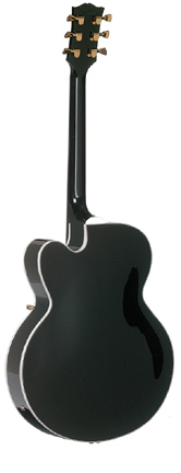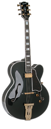L-5 CES (HSLC{ }GH) | - single round cutaway bound body, carved spruce top, layered tortoise pickguard, bound f-holes, maple back/sides/neck, 20-fret bound pointed ebony fingerboard with pearl block inlay, ebony bridge with pearl inlay on wings, model name engraved trapeze tailpiece with chrome insert, multi-bound blackface peghead with pearl flame/logo inlay, 3-per-side tuners, gold hardware, 2 covered humbucker pickups, 2 volume/2 tone controls, 3-position switch, available in Natural, Wine Red, Ebony, or Vintage Sunburst finish, this model is part of the Historic Collection, current mfg. |