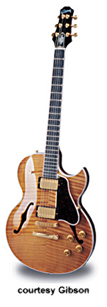 L-5 STUDIO (CSL5[ ]NH) | - single rounded cutaway semi-hollow body, carved spruce top, black body binding, 2 f-holes, 20-fret ebony fingerboard with mother-of-pearl dot inlay, ABR-1 bridge with pearl inlay on wings/metal Bail raised tailpiece, blackface peghead with pearl logo inlay, 3-per-side Schaller tuners, "Ice Cube Marble" pickguard, nickel hardware, 2 covered humbucker ('57 Classic) pickups, 2 volume/2 tone controls, 3-position switch, available in Autumnburst (AB), Trans. Blue (BU), Trans. Red (TR), or Alpine White (new 1999) finish, this model was part of the Custom Collection, mfg. 1997-2000. |
