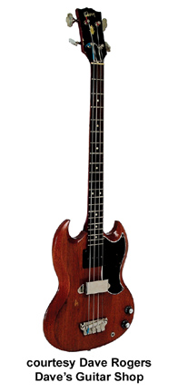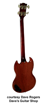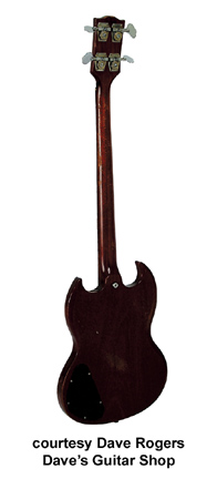 EB-3 | - SG-style double sharp cutaway mahogany body, mahogany neck, 20-fret rosewood fingerboard with pearl dot inlays, black headstock overlay with pearl crown and logo inlay, two-per-side Kluson tuners, bar bridge, aminated black pickguard with finger rest, metal hand rest, one black plastic covered (1961-62) or metal covered (1962-1979) full-size humbucker (neck) and one metal covered small humbucker (bridge) pickups, four knobs (two v, two tone), four-way rotary pickup switch, string mute, nickel hardware, available in Cherry (most common), Ebony (rare, only 10 mfg. 1973), Natural (rare), Walnut (common), or White (rare, approx. 70 mfg. 1976-79) finish, 30.5 in. scale, mfg. 1961-1979. |