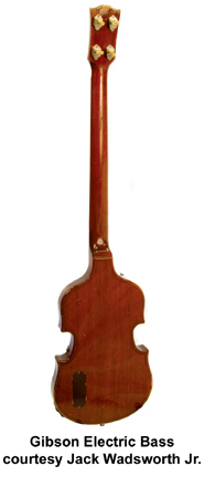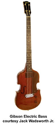 GIBSON ELECTRIC BASS (MFG. 1953-1958) | - violin-shaped mahogany body, arched top with painted f-hole/purfling, raised black pickguard, mahogany neck, 20-fret rosewood fingerboard with pearl dot inlay, bar bridge, blackface peghead with pearl logo inlay, 2-per-side Kluson banjo tuners, nickel hardware, covered alnico pickup, volume/tone control, available in Dark Brown finish, approx. 550 mfg. 1953-58. |