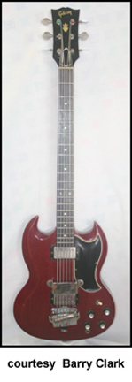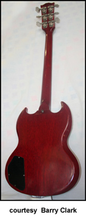 EB-6 Solid Body | - 6-string configuration, double sharp cutaway solid mahogany (SG shaped) body, all metal tuners, dot inlays, larger metal tuning keys, two humbucker pickups, four knobs, (2 volume, 2 tone), black pickguard, 30.85 in. scale, available in Cherry finish, approx. 68 mfg. 1962-67. |