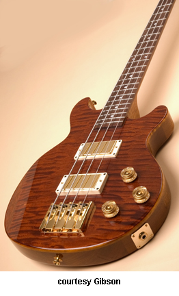 LES PAUL SIGNATURE BASS | - hollow offset double cutaway, arched maple top, raised cream pickguard, f-holes, walnut back/sides, mahogany neck, 22-fret rosewood fingerboard with pearl trapezoid inlay, fixed bridge with cover, 2-per-side tuners, chrome hardware, humbucker pickup, plastic pickup cover with stamped logo, volume/tone controls, level switch, available in Gold Top or Sunburst finishes, approx. 625 mfg. 1973-79. |