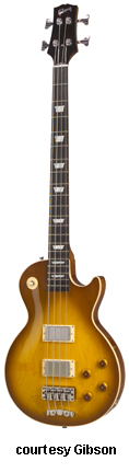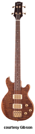 LES PAUL BASS | - single sharp cutaway solid mahogany body, bound body, control plate, mahogany neck, 24-fret bound rosewood fingerboard with pearl block inlay, fixed bridge with metal cover, bound peghead with pearl split diamond/logo inlay, 2-per-side tuners, chrome hardware, 2 humbucker pickups with metal rings, volume/treble/bass controls, 3-position pickup/tone switches, impedance/phase switches, 30.5 in. scale, available in Walnut finish, approx. 2,575 mfg. 1971-1976. |