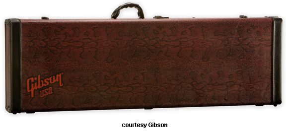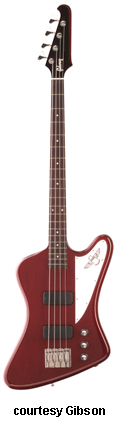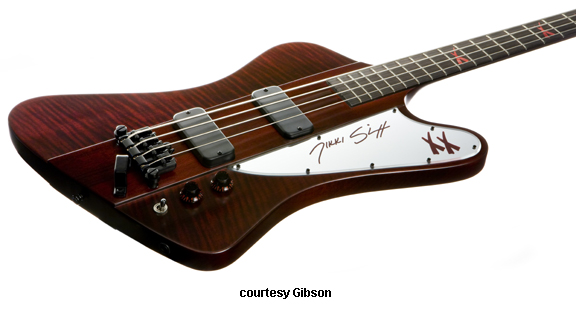 NIKKI SIXX THUNDERBIRD BASS (BAN2) | - asymmetrical "hourglass" AAA maple body, set mahogany/walnut laminated neck, 20-fret ebony fingerboard with red acrylic X inlays, black headstock overlay with red Gibson logo, four-on-one-side Grover bass tuners, three-point adj. bass bridge, Opti-Grab bracket, white pickguard with red "Nikki Sixx" and X graphics, two TB+ humbucker pickups, two black top hat knobs with red lettering (v, tone), kill switch, jack on side of bass, black chrome hardware, available in Black Cherry finish, 34 in. scale, hardshell black/red snakeskin case included, mfg. 2008-present. |