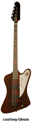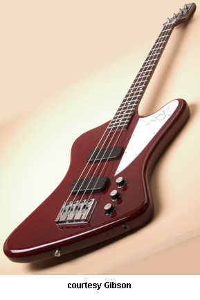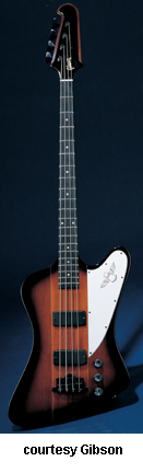 THUNDERBIRD IV (BAT4, CURRENT MFG.) | - asymmetrical hourglass style mahogany body, white pickguard with engraved Thunderbird symbol, through-body nine-piece mahogany/walnut neck, 20-fret ebony fingerboard with pearl dot inlay, fixed bridge, partial blackface peghead with pearl logo inlay, four-on-one-side tuners, black chrome hardware, two covered pickups, three knobs (two v, one tone), available in Cardinal Red (disc. 1994), Classic White (disc. 2007), Ebony (disc. 2008), Ebony Stain (1999-2004), Natural (1999-2004), Natural Burst (1999-2004), Tobacco Sunburst (1994-98), or Vintage Sunburst (1987-1994, 1999-present) finish, mfg. 1987-present. |