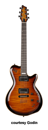 LGX-SA WITH SYNTH ACCESS | - rounded single cutaway mahogany body, carved figured maple top, mahogany neck, 22-fret ebony fingerboard with dot inlay, "Godin style" tune-o-matic bridge/strings into-body "fingers," three-per-side tuners, gold hardware, two Godin Tetrad (twin blade) or Seymour Duncan humbucker pickups, microtransducer bridge pickup, volume/synth volume/tone controls, five-way magnetic pickup selector switch, magnetic/mix/transducer mini-switch, Program Up/Down synth control toggle mini-switch, volume/treble/mid/bass transducer controls (four sliders in bass bout), 13 pin connector for Roland GR series guitar synths, three outputs (magnetics, bridge/mix, 13 pin connector), available in Black Pearl (disc., 10547), CognacBurst (Model 10523/24087), Mahogany (disc., 4911), Trans. Amber (disc., 4928), or Trans. Blue (Model 4904/22922) high gloss finish, 25.5 in. scale, current mfg. |